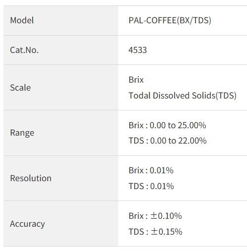 PAL-COFFEE (Brix un TDS divkāršs pārdošanas apjoms), ko slaveni baristas izmanto savos svarīgākajos instrumentos, ir ar augstu izšķirtspēju 0,01%. Var izmērīt smalko atšķirību kafijas un espresso koncentrācijā. Stabili rādījumi ir iespējami pat ar augstas temperatūras, svaigu brūvējumu, pateicoties nepārtrauktas mērīšanas funkcijai.
