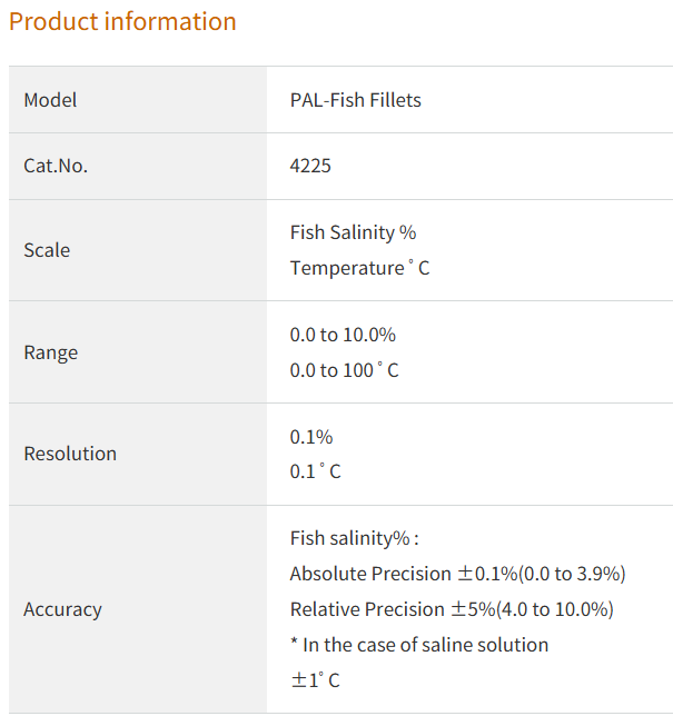 Zivju filejas sāļuma mērītājs PAL-Fish Fillets — ideāli piemērots gan žāvētu, gan jēlu fileju mērīšanai! Tagad ir iespējams izmērīt tuvāk titrēšanas vērtībām un precīzāk ar minimālu kļūdu 0,0%*(Rezultāti ir atkarīgi no mērāmo žāvēto zivju un jēlu fileju veida un novietojuma.)! Turklāt, paplašinot temperatūras kompensācijas diapazonu līdz 5–40 ゚C, kas vairāk atbilst faktiskajai apkārtējās vides temperatūrai, mērījumi ir kļuvuši stabilāki. Ievietojiet zondi filejā un tikai 3 sekundēs saņemiet vērtību, kas ir tuvu titrēšanai. Žāvētām zivīm ieteicams mērīt vēdera rajonā. PAL-Fish Fillets atbrīvo lietotāju no iepriekšējo metožu radītajām grūtībām un nepatikšanām!